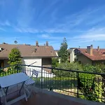 Moderne detaljer indeholder en balkon, et skrivebord og et fladskærms TV med satellitkanaler.